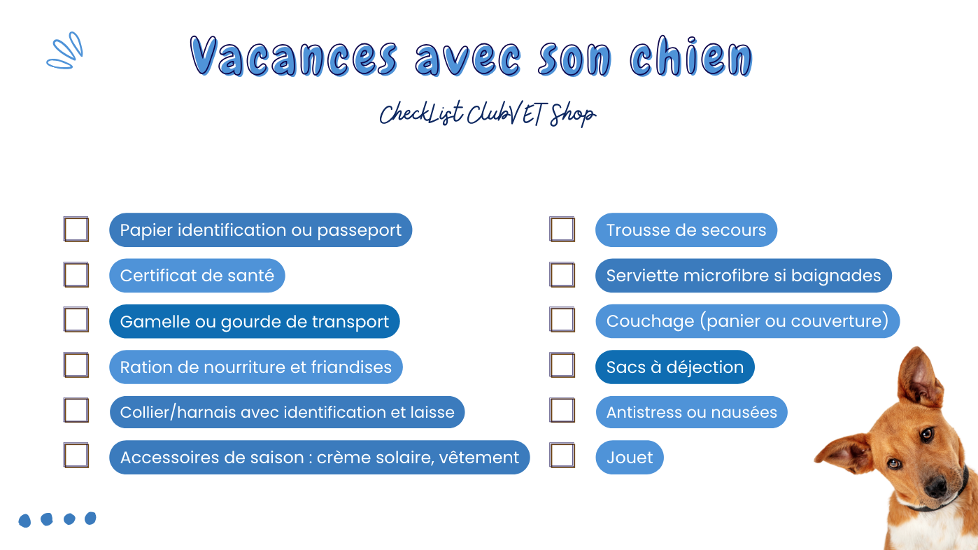 Maintenant vous avez toutes les informations pour partir en vacances avec votre chien.N'hésitez pas à demander conseil à votre vétérinaire en cas de doute.