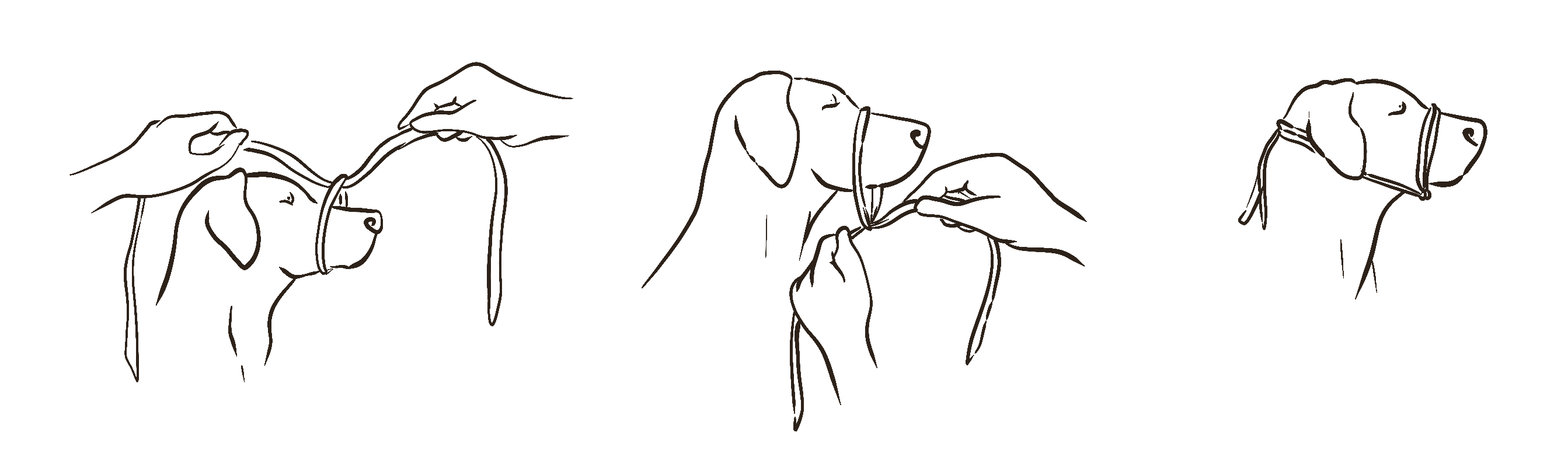 • croisez les deux brins du lien sous le museau et passez-les derrière la tête pour les nouer.