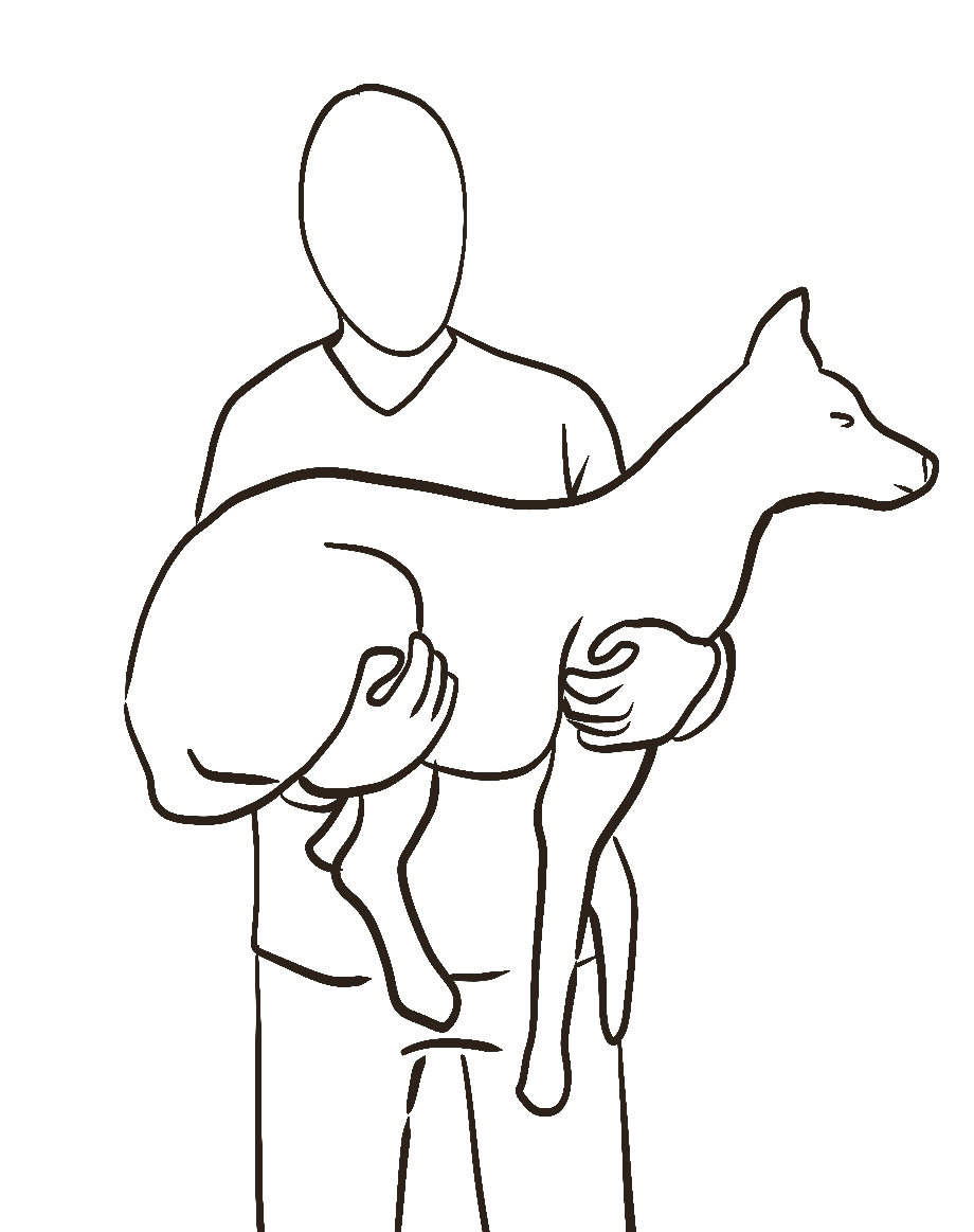 Si possible, mettez l'animal la tête vers le bas en plaçant son dos contre votre poitrine, s'il est trop grand placez-vous derrière celui-ci et entourez son abdomen de vos bras.