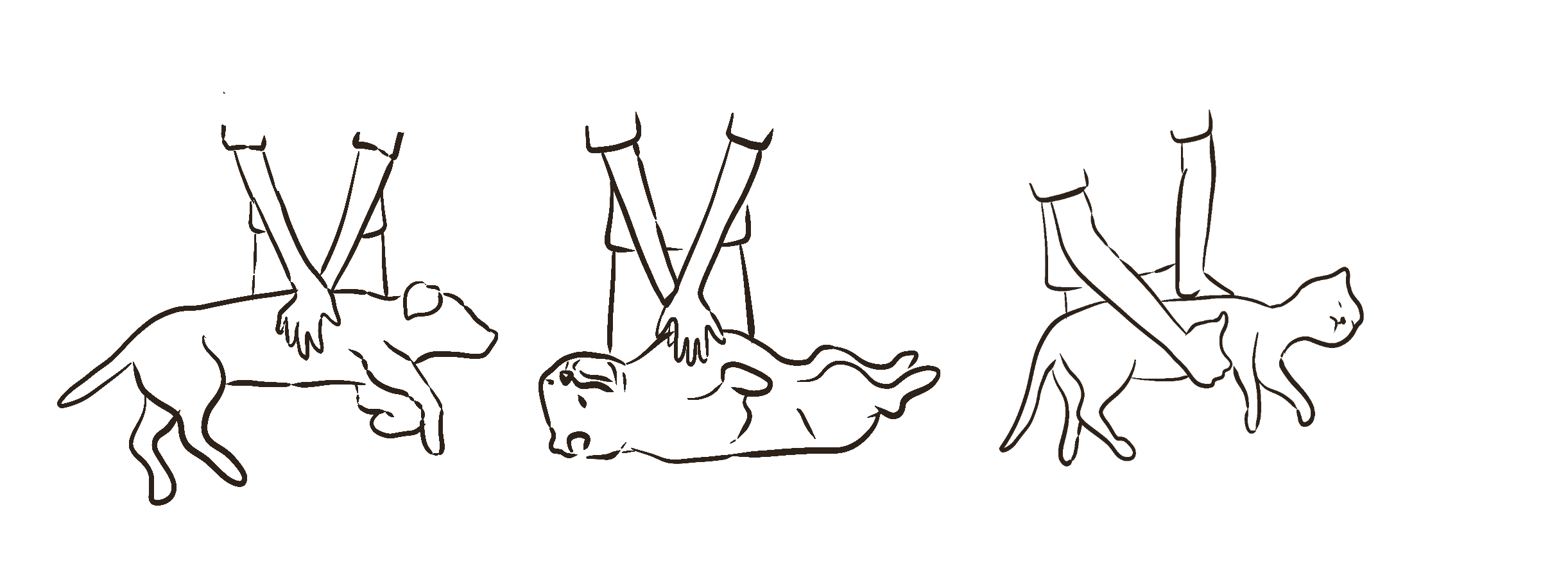 - Petit gabarit (chiens / chiots / chats) : une main de chaque côté de la poitrine et si très petit, un pouce d'un côté et les doigts de l'autre main.